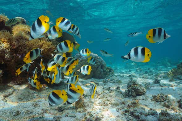 Iniciaremos a travessia pela lagoa azul e navegaremos pelas águas em busca dos seus simpáticos habitantes. Durante o trajeto, poderemos observar inúmeros peixes tropicais coloridos e enormes formações de coral. Além disso, pode ser que nos cruzemos com raias, tartarugas marinhas e até tubarões.