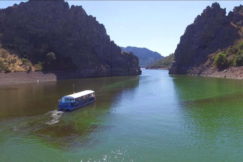 No horário indicado, nos reuniremos no cais de Ceclavín e subiremos em um barco com o qual daremos um agradável passeio pelos Canchos de Ramiro. Vamos?