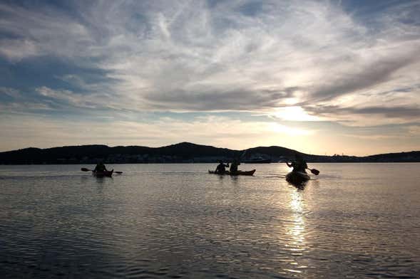 Depois, voltaremos de caiaque e seguiremos remando para ver o entardecer de Fornells de uma perspectiva única. Você vai se apaixonar pelas cores alaranjadas que se refletem na água. Quando o sol tiver desaparecido no horizonte, navegaremos sob a luz das estrelas até o ponto de encontro.