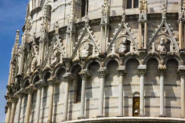 Neste recinto amuralhado, declarado Patrimônio da Humanidade pela Unesco, está boa parte dos monumentos mais famosos de Pisa. Começaremos nosso passeio pelo “prado” mais célebre da região toscana aproximando-nos até a base do Batistério de São João, o maior da Itália. Essa construção circular dedicada ao batismo data do século XII. Embora o monumento seja eminentemente românico, do exterior contemplaremos a impressionante decoração de sua cúpula gótica.