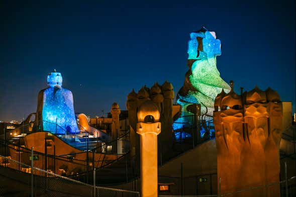 Following the guided tour, we'll climb to the famous rooftop to enjoy the audiovisual spectacle that is La Pedrera Night Experience. The famous chimneys of Casa Milá are transformed into gigantic screens upon which different lights and shapes are projected via modern video mapping techniques, and al synchronised with music to create a perfect blend of image and sound.