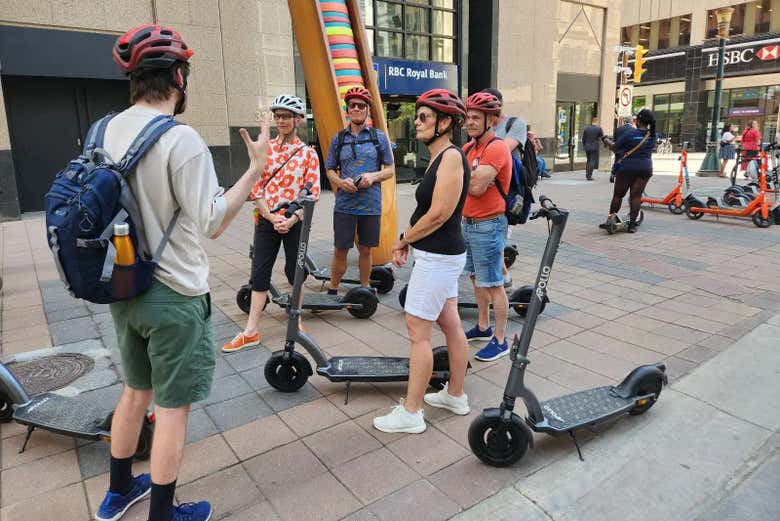 At the indicated time, we'll meet on 8th Ave, and start this exciting e-scooter tour of the city. Calgary blends the rural prairies and the bustling city to perfection. Ready for a fun exploration of this unique place? Let's go!