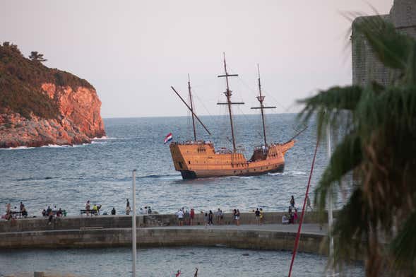We'll set sail from the old Dubrovnik port in the evening, leaving the city slowly behind as the orange tones of the sunset dye the docks. We'll see the sunset on the Dalmatian coast as you enjoy a glass of champagne on the deck of an impressive galleon with thick masts and white sails.