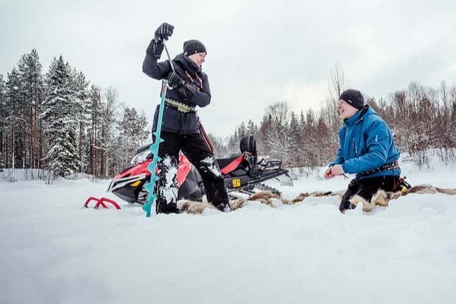 To make this day even more special, we'll get on snowmobiles to explore the snowy forests around Kittilä until we reach a frozen lake. After taking in the wonderful Finnish scenery on the way, we'll get off the snowmobiles and learn how to ice fish like a local.