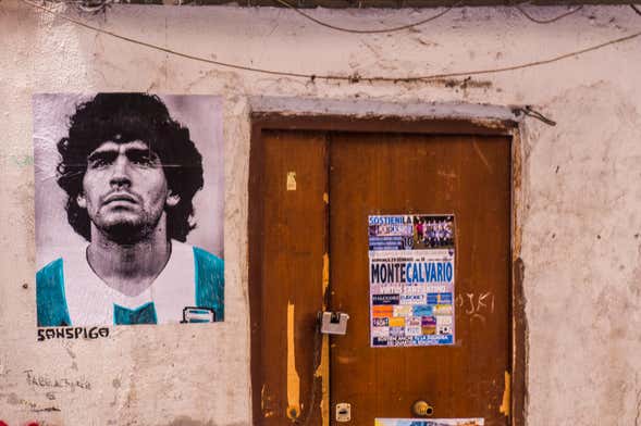 After seeing the beautiful Piazza Plebiscito, we'll begin our ascent to the Quartieri Spagnoli via the funicular railway steps. We'll walk through narrow, cobblestone streets, past majestic palaces and Baroque façades until we finally arrive at the mural of Diego Armando Maradona.