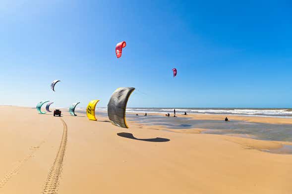 Alcanzaremos un lugar donde las aguas son más tranquilas, pero con un viento fuerte y constante, que será perfecto para iniciar nuestra actividad de kitesurf en Ilha das Canarias. Surfearemos ayudados por el viento en este punto en el que las aguas fluviales se encuentran con el océano. ¡Será una experiencia increíble!