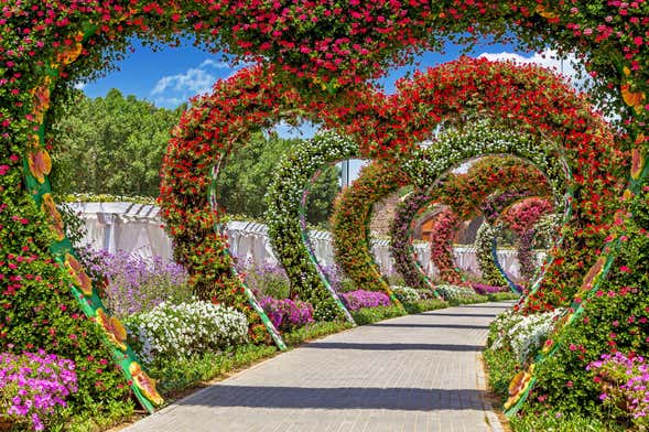 Durante vuestra visita al Jadín del Milagro podréis maravillaros también con la creatividad de sus increíbles formas florales, que convierten a este espacio botánico en uno de los principales atractivos de los Emiratos Árabes Unidos.