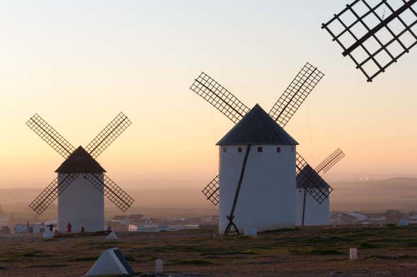 Después, caminaremos hacia el cerro Calderico, una colina que domina el paisaje manchego. Allí se alzan cuatro molinos de viento, que forman parte de la llamada Crestería Manchega. ¿Sabíais que uno de ellos es el mejor conservado de España? ¡Podréis entrar en su interior y ver cómo funciona!