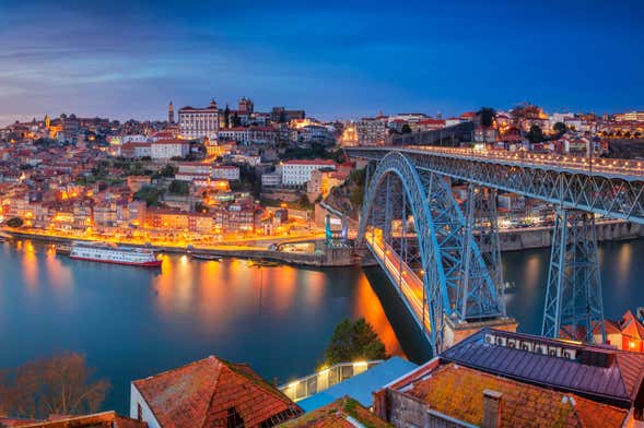 Después, pasearemos por las calles iluminadas de Oporto mientras nos aproximamos al río Duero. Una vez lleguemos al límite cruzaremos a la otra orilla paseando por uno de los puentes más icónicos de la ciudad, el puente de Luis I. Desde él disfrutaréis de unas impresionantes vistas y comprenderéis por qué es uno de los lugares más típicos para capturar una bonita foto.