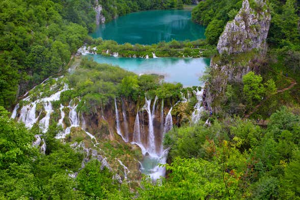Le premier arrêt sera le Parc national des lacs de Plitvice, un environnement unique inscrit au patrimoine mondial de l'humanité. Vous ferez une visite à pied à travers ses différents sentiers boisés, depuis lesquels vous pourrez profiter du spectacle naturel fascinant offert par les lacs et les cascades de Plitvice. Ici, les chutes d'eau atteignent plusieurs dizaines de mètres de hauteur !