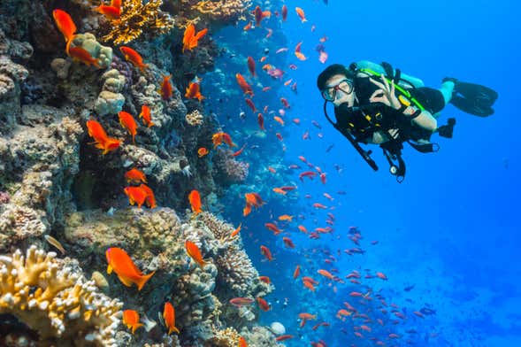 Una volta giunti a destinazione, ci aspetterà una breve spiegazione preliminare. Il nostro istruttore ci indicherà in modo chiaro e semplice le norme e le procedure basiche da seguire sott'acqua. Dopo la teoria, passeremo alla pratica e potremo indossare l'attrezzatura da immersione: pinne, occhiali, boccaglio, bombole... Siamo pronti per immergerci nelle acque dell'arcipelago canario!