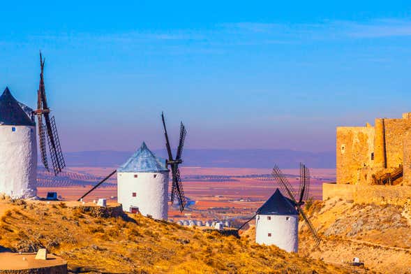 Seguiremos el tour explorando uno de los paisajes más bonitos de Castilla-La Mancha, los molinos de viento. Pasearemos por el cerro de Consuegra, coronado ni más ni menos que por 12 molinos de viento. Nos adentraremos en un antiguo molino de viento para conocer los secretos del arte de la molinería mientras rememoramos la famosa obra Don Quijote de La Mancha de Miguel de Cervantes.