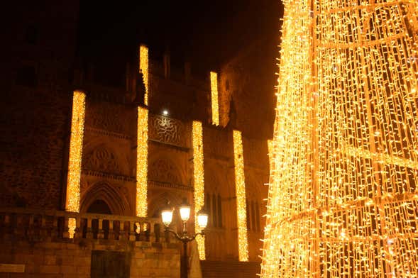 Pasaremos también por la plaza de Santa María de Guadalupe para maravillarnos con el alumbrado navideño y, por supuesto, nos detendremos ante la fachada del Real Monasterio, que estará iluminada con luces doradas. ¡Una imagen de ensueño!