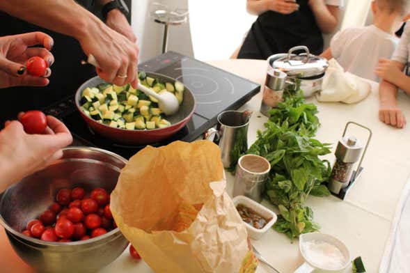 Após a oficina de massas, prepararemos um segundo prato à base de peixe e legumes. Uma vez finalizada a receita, nos sentaremos à mesa para saborear as iguarias que preparamos, acompanhando o banquete com vinho siciliano.