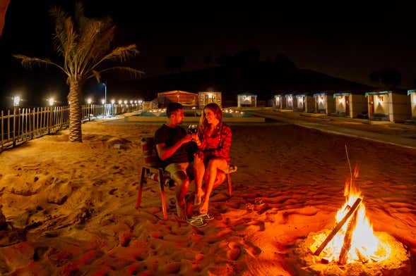 Se preferir, você pode ficar no acampamento para assistir ao pôr do sol sobre o deserto. Quem desejar, também pode optar por praticar sandboard nas dunas, ou por uma atividade de pintura de henna. E se quiser tomar um banho refrescante, pode ficar na zona de piscinas do acampamento.
